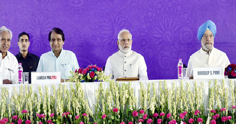 PRIME Minister Narendra Modi has called achieving double-digit GDP growth to challenge the USD 5 trillion economies and doubling India’s share in world trade to make the country economically stronger. Addressing a gathering after laying the foundation stone of a new office complex of the Ministry of Commerce Vanijya Bhawan in Delhi, PM said his government has taken several initiatives in easing the process of doing business in India. Foreign Direct Investment inflows in India and foreign exchange reserves are at record highs, he said. We have ensured macroeconomic indicators like current account deficit (CAD) does not cross the Lakshman Rekha.India’s GDP growth touched 7.7 per cent in the last quarter of 2017-18 Financial Year. Time has come to look beyond 7-8 per cent growth and target double-digit expansion, PM Modi said. It will not be a Himalayan task if all concerned worked in this direction, he added. The world, he said, is watching as to when India will break into the USD 5 trillion economy club by doubling its economy. India must try to reduce dependence on imports of crude oil at the cost of vital foreign exchange outgo. For this purpose, we have increase domestic manufacturing. He said the country has moved away from a culture of delaying work through ‘atkana, latkana and bhatkana’ meaning obstructing, delaying and misguiding. The Goods and Services Tax (GST), which replaced over a dozen indirect taxes from July 1 last year, has led to not just ease of doing business but also increased tax base benefitting  national economy .For instance, ,PM said  54 lakh new taxpayers have sought registration under the GST regime totalling the number of indirect tax payers to over ten million in India compared to six million indirect tax payers in pre-GST era. Foreign direct investment inflows as well as foreign exchange reserves are at record highs, he added. The Prime Minister expressed confidence that the building will be completed well within the stipulated time. He emphasized that this would be in keeping with the spirit of New India, and moving away from old practices, under which important building projects, even in the Capital, had been inordinately delayed. In this context, he mentioned the Dr. Ambedkar International Centre, the Dr. Ambedkar National Memorial, the Pravasi Bharatiya Kendra and the new office building for the Central Information Commission. He said that this is also the result of breaking silos within the working of the Government. He hoped that the new office building – Vanijya Bhawan – would further facilitate elimination of silos in India’s commerce sector. Speaking about the country’s demographic dividend, the Prime Minister said that it is our collective responsibility to fulfil the aspirations of our youth. Talking of adoption of digital technology, the Prime Minister remarked that the land, on which the new building is being constructed, was earlier occupied by the Directorate General of Supplies and Disposal. This has now been replaced by the Government e-Marketplace which has seen transactions worth Rs. 8700 crore in a short time, he added. He urged the Department of Commerce to work towards further expansion of GeM, and leverage it for the benefit of the country’s MSME sector. He also spoke of the benefits of GST, and said the Union Government is making constant efforts to create a people-friendly, development-friendly and investment-friendly environment. The Prime Minister mentioned various macro-economic parameters, and other indicators to explain how the India is now playing an important role in the global economy. He said India is now among the top five fin-tech countries, globally. He said subjects such as “Ease of Trading,” and “Ease of Doing Business,” are all related to “Ease of Living” in an interconnected world. The Prime Minister emphasized the need for an increase in exports, and said that States must be made active partners in this effort. He said the Department of Commerce must resolve to raise India’s share in total global exports to at least 3.4 percent, from the current 1.6 percent. Similarly he said, efforts must be made to raise domestic manufacturing output, to reduce imports. In this context, he gave the example of electronics manufacturing. He said the Union Government has taken a number of steps to boost domestic manufacturing.
